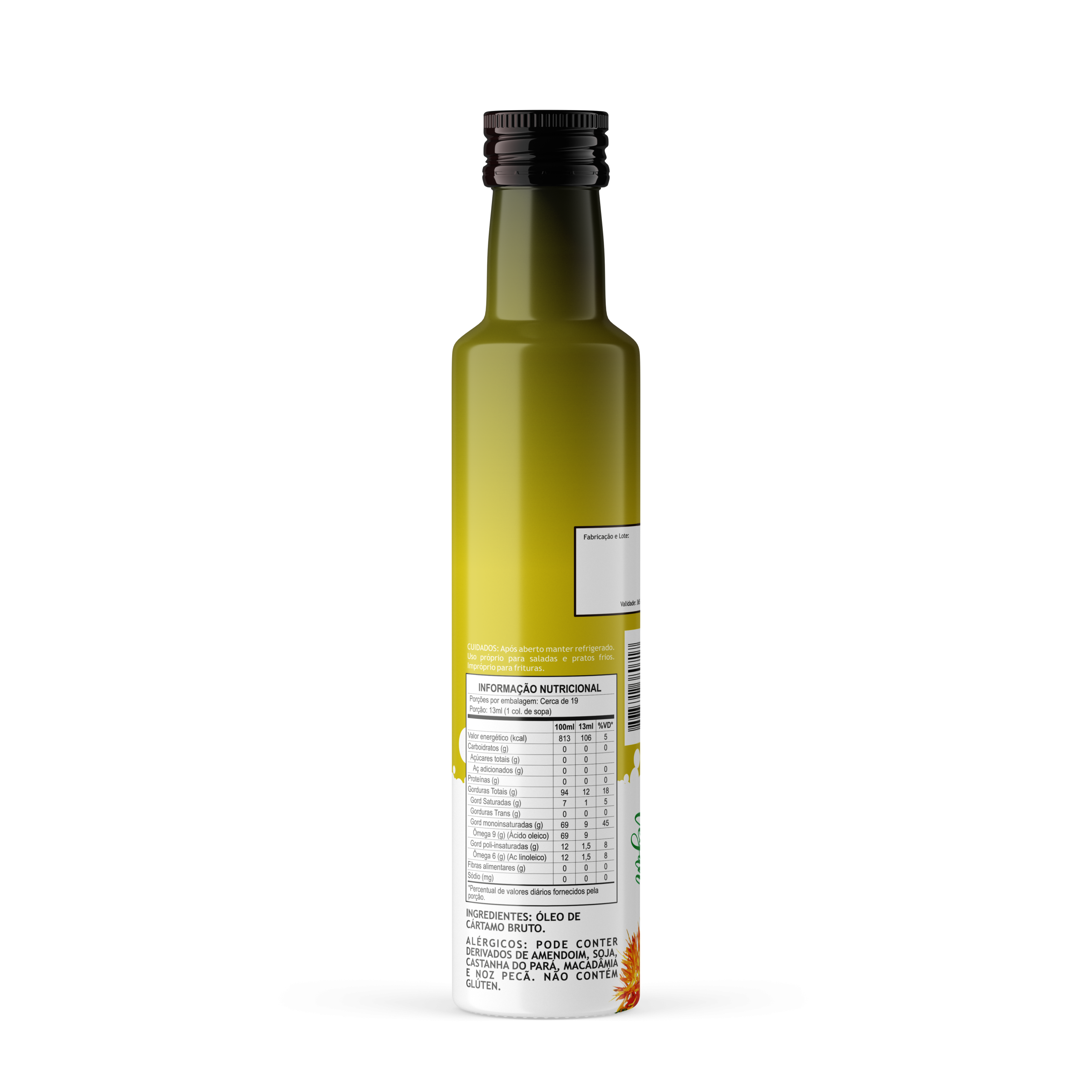 O Óleo de Cártamo, originário da Índia, é uma planta com altos teores de óleos (cerca de 40%) em suas sementes, especialmente em ácidos oléico e linoléico. Fonte de Ômega 3, 6 e 9. Acrescente como tempero de saladas e na preparação de pratos especiais.